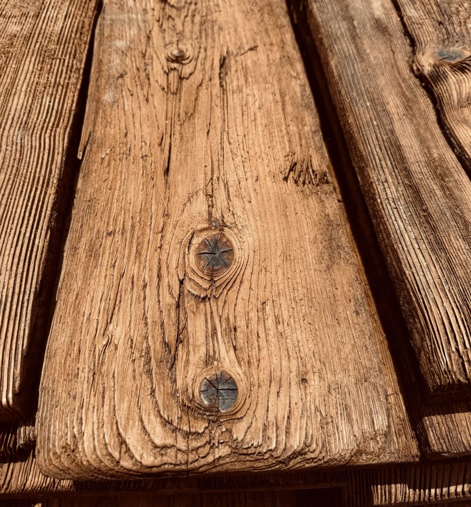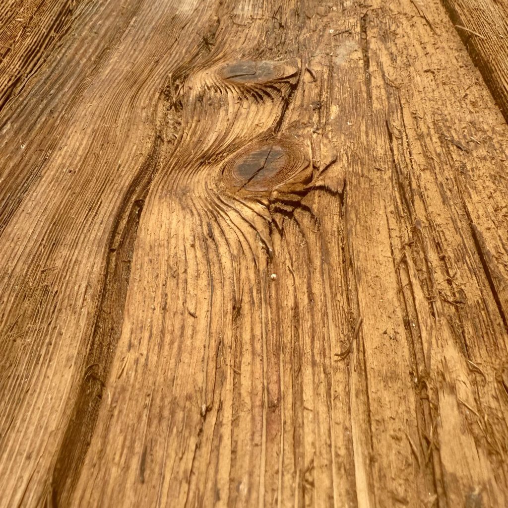 These boards begin their life as antique hemlock, but it’s the mushroom growing process that gives them their character. Used to line the walls of mushroom cultivation rooms, the wood is exposed for years to spores, compost-rich soil, and high humidity. This environment reacts with the fibers of the wood, breaking them down in uneven patterns and leaving behind a washboard texture and deep, organic grooves you can’t replicate any other way. The result is a truly one-of-a-kind material that’s both reclaimed and naturally enhanced.