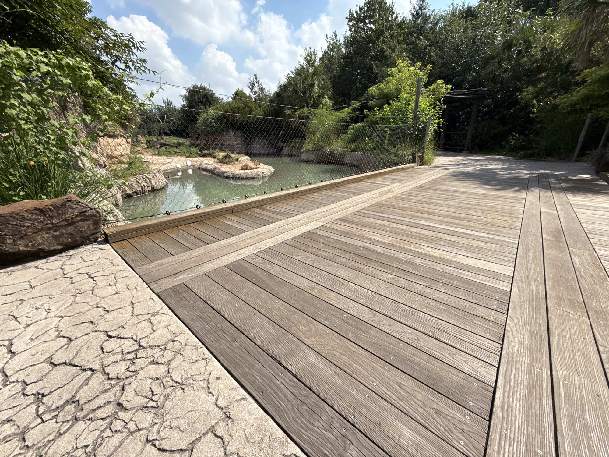 While the Zoo has worked with numerous teams over time, Tellepsen Builders served as the primary general contractor for much of the renovation, hiring skilled subcontractors—including Texas Exterior Systems—to bring the work to life. Mason’s Mill & Lumber supplied Thermory Benchmark Ash for key exterior features, including both the Pantanal Bridge and Jack’s Café, helping bring the Zoo’s natural design vision to life, one project at a time.