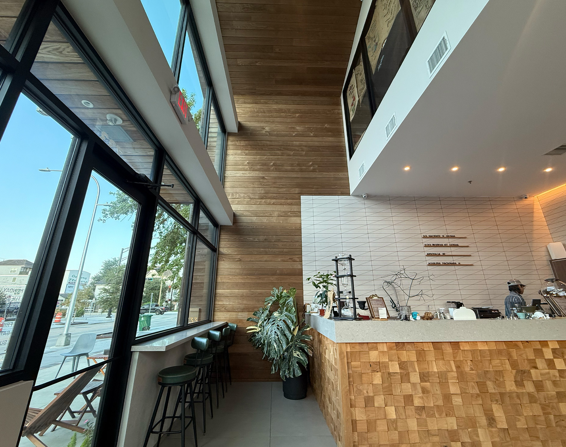 A key design element at Simply Coffie is the extensive use of Thermory Ash, a thermally modified wood known for its durability, dimensional stability, and rich aesthetic character.
