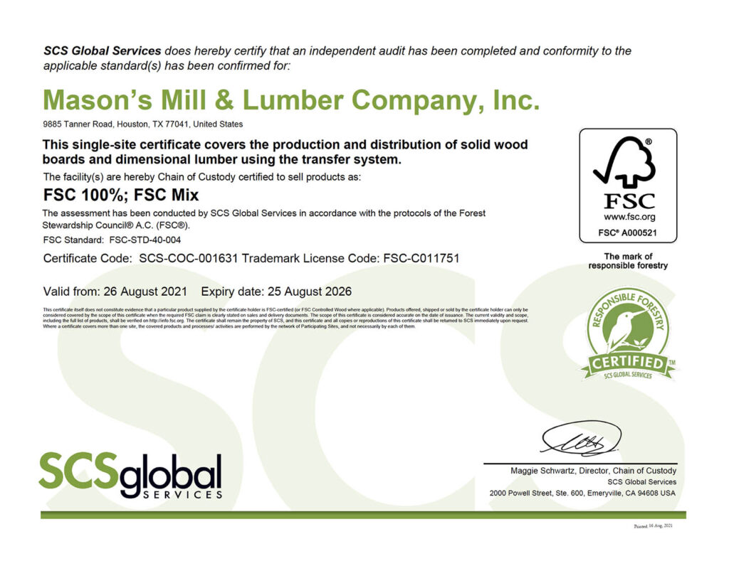 Mason’s Mill & Lumber Co. is committed not only to customer satisfaction and service but also to maintaining the beautiful planet we inhabit. We hold a certificate from the Forest Stewardship Council® (FSC®) and maintain the chain-of-custody requirements as a lumber and plywood distributor as well as a custom moulding manufacturer.